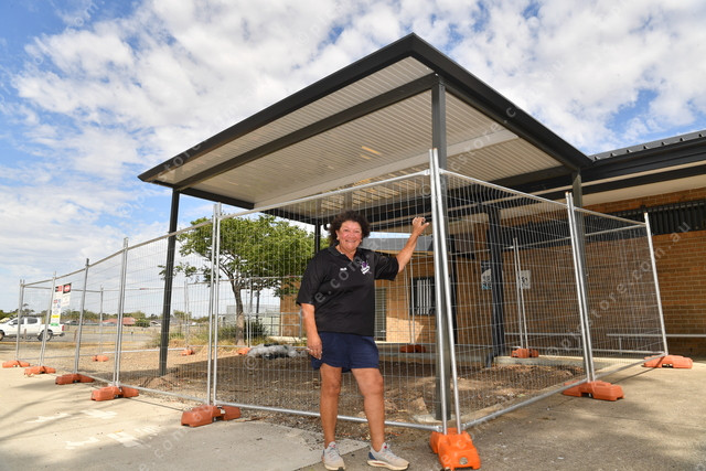 Pic of Julie Baxter from the Sunbury Softball Association at the clubhouse at John McMahon Reserve in Sunbury standing with the new shades. Photo by Damjan Janevski. 464942_02