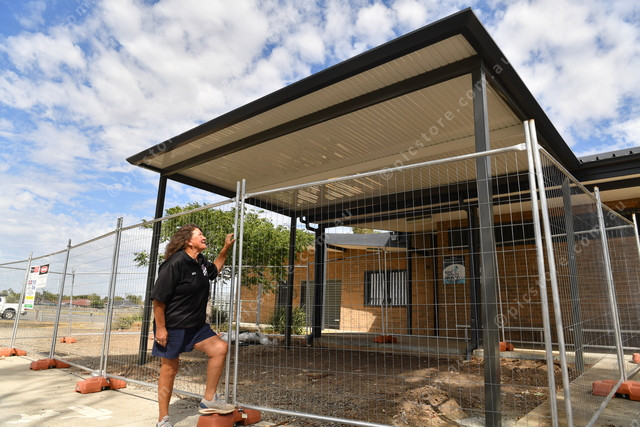 Pic of Julie Baxter from the Sunbury Softball Association at the clubhouse at John McMahon Reserve in Sunbury standing with the new shades. Photo by Damjan Janevski. 464942_03