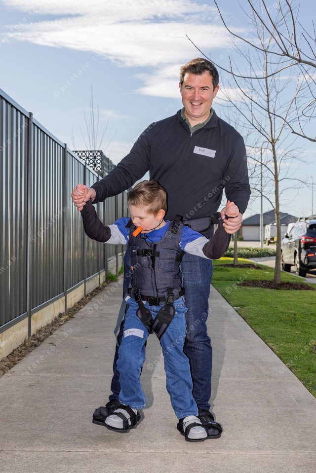 Matt Contuzzi and Lloyd Pinn go for a walk. Brad and Lloyd are wearing a special harness called the Upsee.