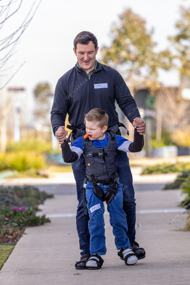 Matt Contuzzi and Lloyd Pinn go for a walk. Brad and Lloyd are wearing a special harness called the Upsee.
