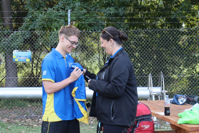 Kynon received his nationals swimming cap and t-shirt from head coach Duana Mcleod on Wednesday 9 April. (Mikayla van Loon: 471908)