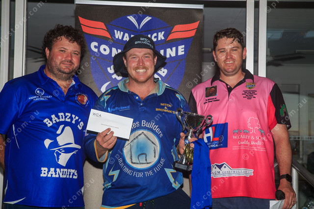 Mitch/Browns Captain Lachlan Berge collecting the winners spoils from President Alastair Costello and Dave Walker. Photo Chris Munro