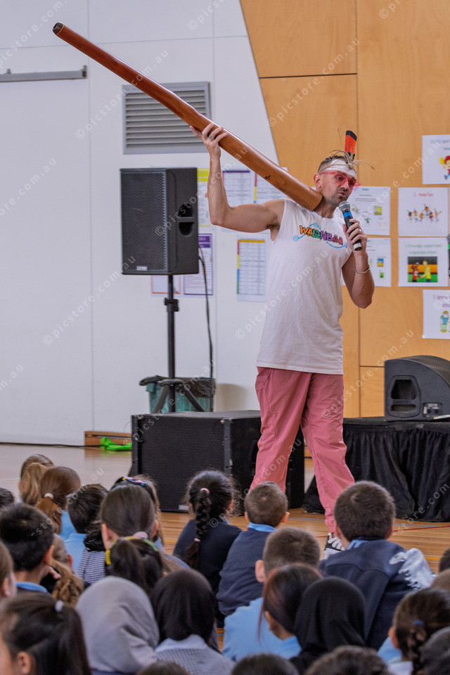 Mitch Tambo performing and talking to the kids.