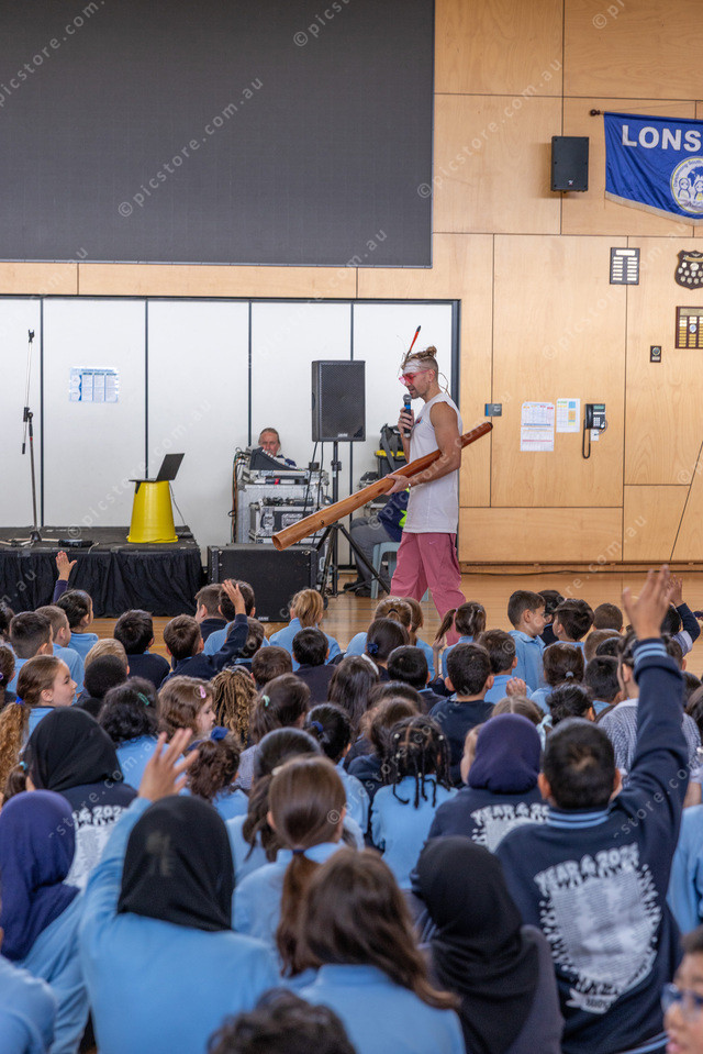 Mitch Tambo performing and talking to the kids.