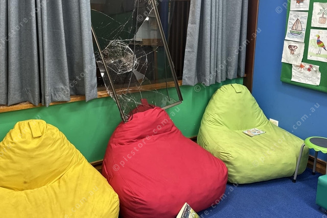 SMASHED: One of many smashed or shattered windows following a wanton vandalism attack on the library at Tennant Creek. (PIC: BARKLY REGIONAL COUNCIL)