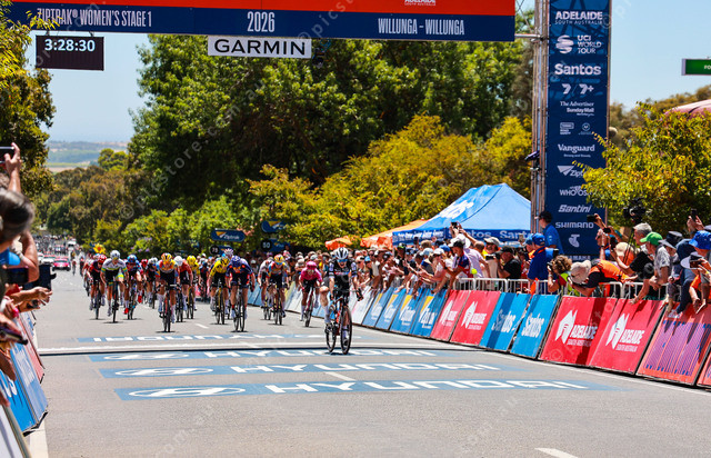 Ally Wollaston crosses the line first at Willunga for Stage one of the Women’s Tour Down Under. (Jesse Ehlers 529445_02)