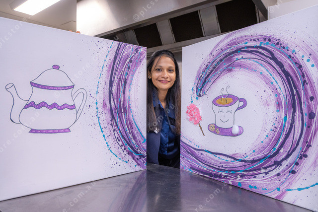 Cassandra Thaddaus Merinda Park Learning Centre Manager with a couple of paintings the local kids helped with.
