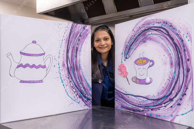 Cassandra Thaddaus Merinda Park Learning Centre Manager with a couple of paintings the local kids helped with.
