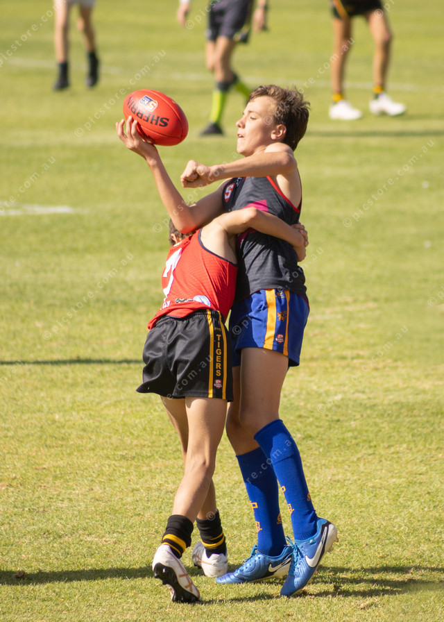 Norwood Blue player Lincoln Stelzer-Linn is about to handball as Norwood Red’s Jaxon Phillips tackles. (476560_06)