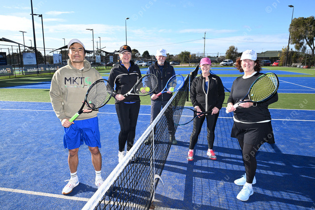 Sunbury Lawn Tennis Club, received grant. Pic of members Dongwood Kang, Vera Kovac Collis, Tom Lain, Jo Durbin and Kim Morris. (Damjan Janevski). 491673_01