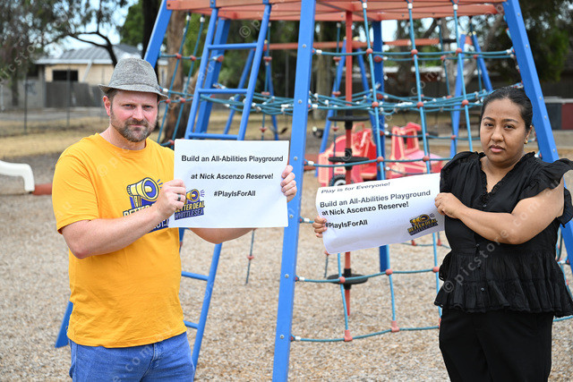 Pic of Nick Brain and Subina Subedi, they are part of a group that has started a petition for an all-abilities playground in Thomastown. (Damjan Janevski). 531944_01