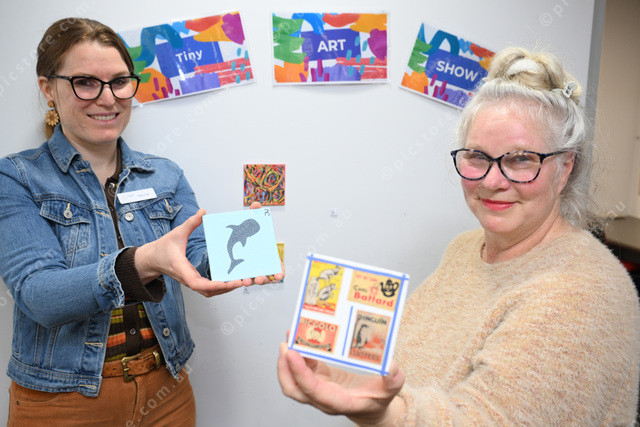Kyneton Library tiny art show. Pic of staff Hannah Thomson and Virginia McKenzie. (Damjan Janevski). 501785_04