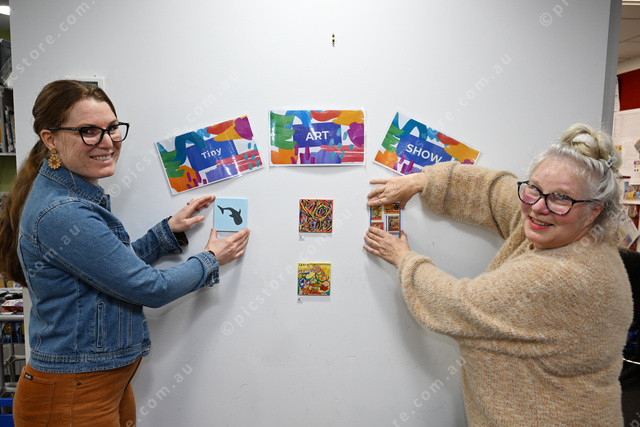 Kyneton Library tiny art show. Pic of staff Hannah Thomson and Virginia McKenzie. (Damjan Janevski). 501785_05