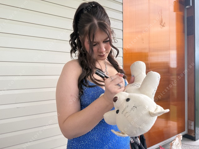 Flooding at the school prevented students the signing of congratulatory posters made by younger students so they signed a teddy bear instead. Seen Here, Elma Gaudron. (Larraine Sathicq: 519441_12)