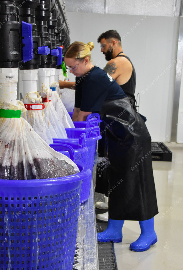 Lyndal Jaynes and Harley Roach draining the water from the seaweed. (Charlotte Martin: 474561_08)
