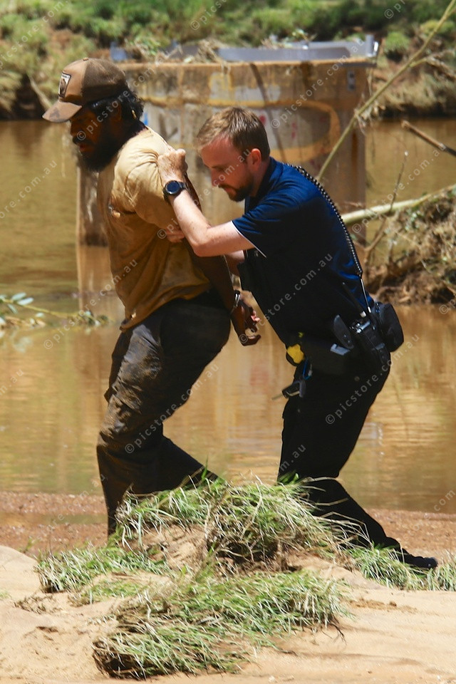 A man is led away after being arrested in the Todd River. (PIC PHIL WILLIAMS 534627_06)