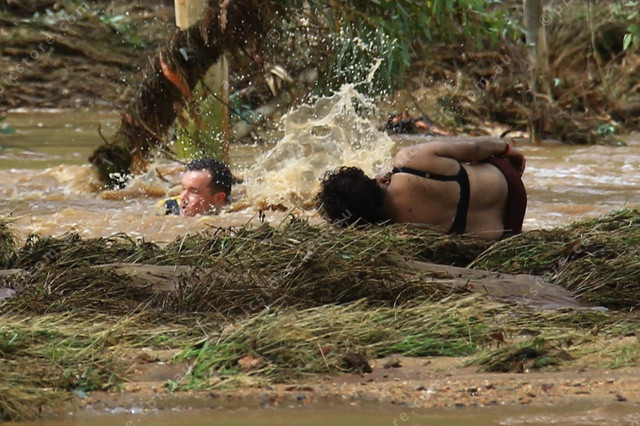 BRAVE: A police officer make a brave attempt to reach a woman stranded in the Todd River. (PIC: PHIL WILLIAMS 534431_02