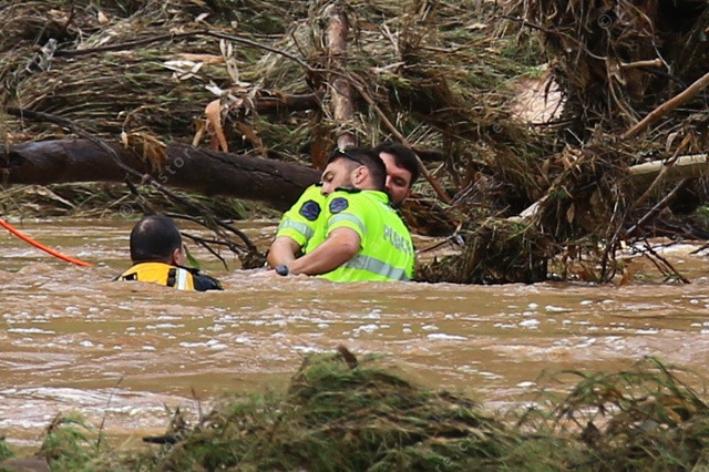 TEAM: Colleagues pull help a police officer who had just failed in a brave attempt to reach a woman stranded in the middle of the Todd River. (PIC: PHIL WILLIAMS 534431_05