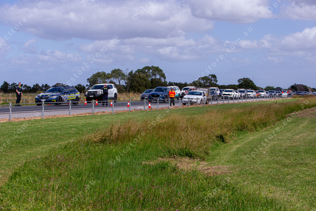 Traffic at the Police stop on the South Gippsland Highway while the riders entered the Highway.