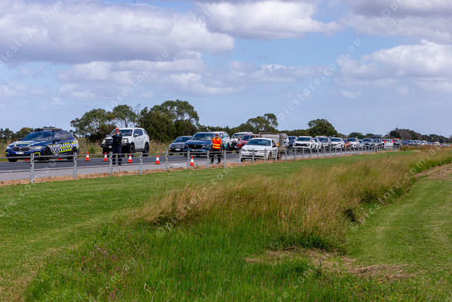 Traffic at the Police stop on the South Gippsland Highway while the riders entered the Highway.