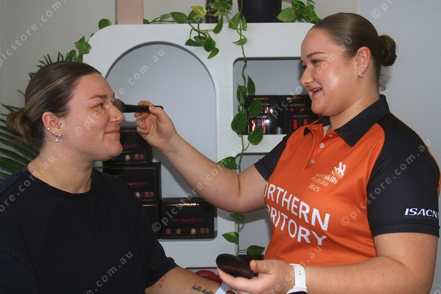 MAKE UP: Lucy Southam applies some make-up to her sister Chloe’s face as she demonstrates the skills that led to her gold medal. (PIC: PHIL WILLIAMS 485538_02)