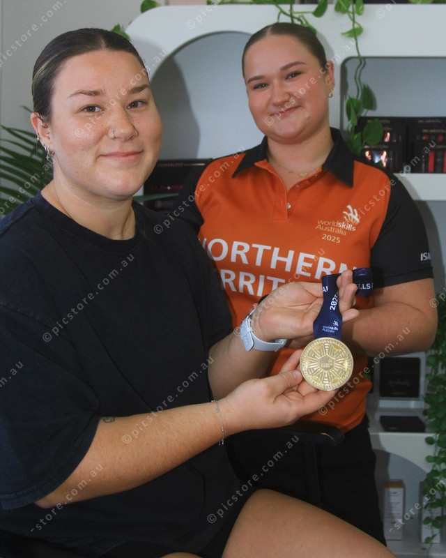 SISTERS: Chloe Southam takes a close look at her sister Lucy’s gold medal. (PIC: PHIL WILLIAMS 485538_04)