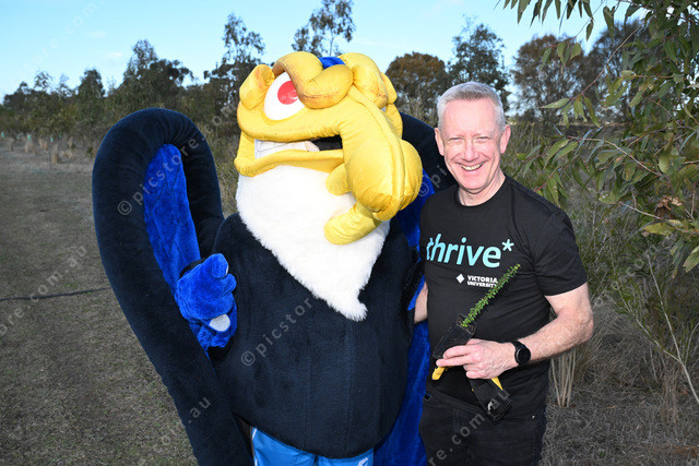 VU, Werribee, community tree planting day. Pic of VU vice chancellor Adam Shoemaker and the VU mascot. (Damjan Janevski). 492849_07