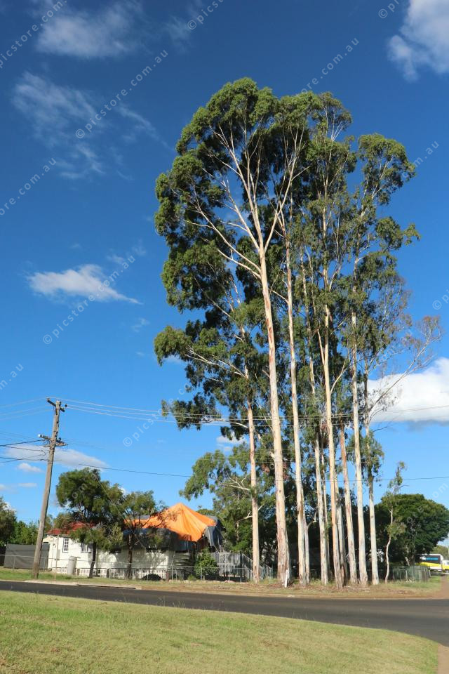 The fate of 12 blue gums on a busy Kingaroy street corner remains uncertain even after a fallen one destroyed a house, with council not committing to cut them down ahead of a major cyclone in the region. (Julian Lehnert: 464075_03)