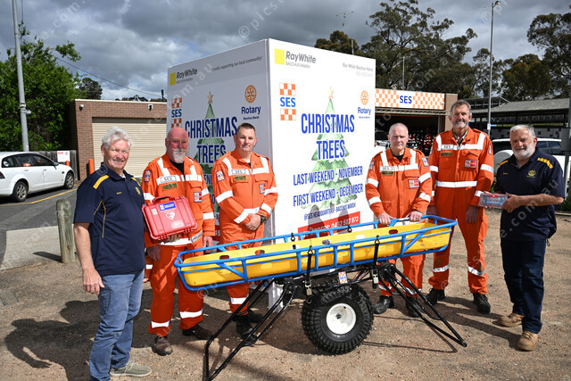 Bacchus Marsh SES, Christmas tree fundraiser. Pic of Scott Pepin (BM Rotary club), SES volunteer Ressel Wells, Mathew Brindley, Andrew Munday, Graham Wilkinson and Russell Dodemaide (BM Rotary Club. (Damjan Janevski). 518745_01