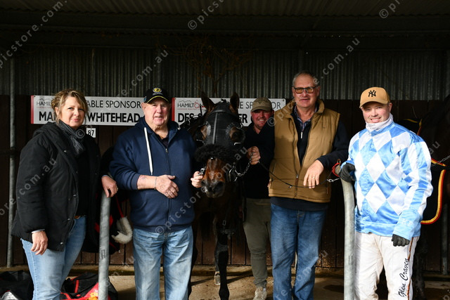 The winner of Race 4 Rockabilly Ringo with her team of trainers.