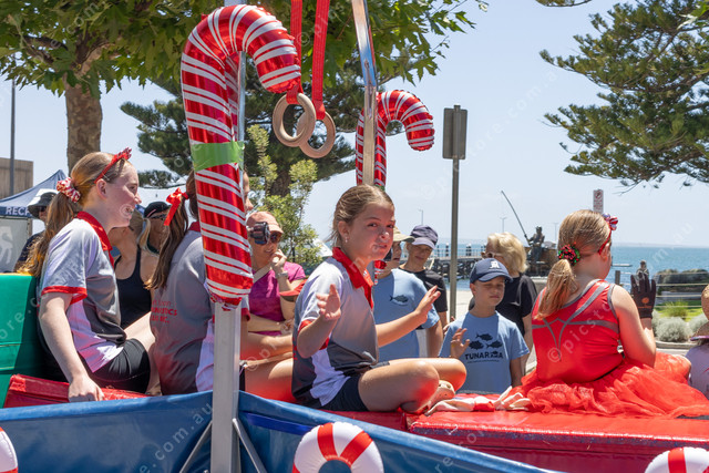 …, centre, waves to both sides of the crowd on the Port Lincoln Gymnastics Club float. (529178_25)