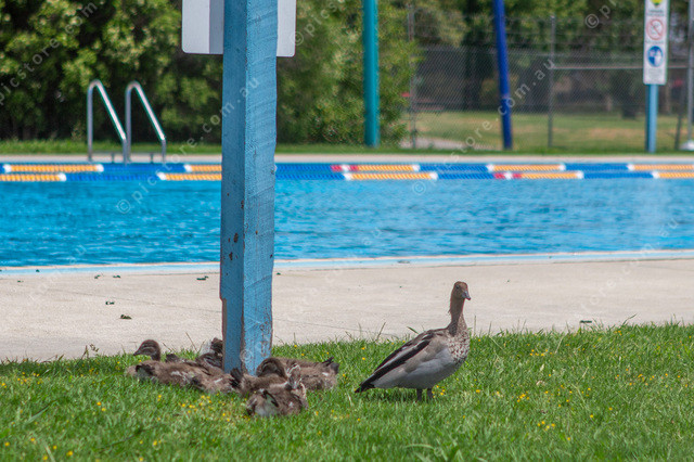 Mother Pacific Black Duck watches over some Ducklings at the Pool next to the market in Pakenham.