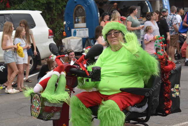 ‘Grinch’ Helen Page gives a wave as she drives her gopher along the parade route. (524588)