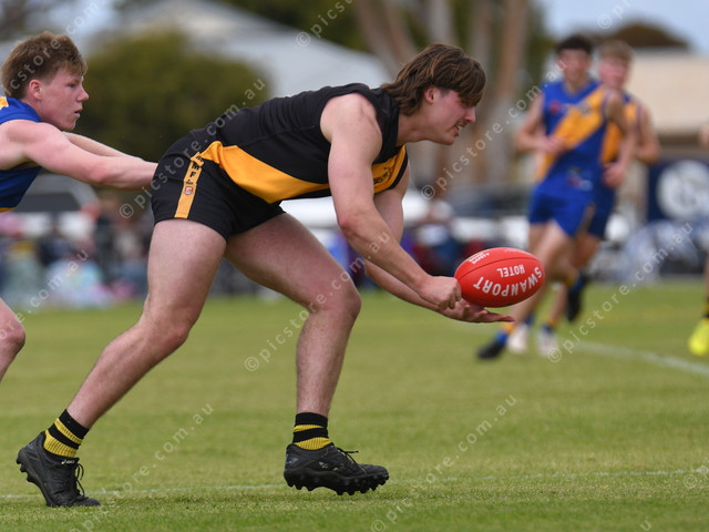 Noah Heym, Mypolonga, attempts a handball under pressure from Jacobi Downs, Tailem Bend. (William Bailey: 505457)