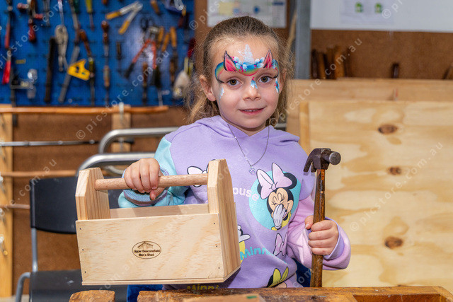 5yo Maddison from Pakenham at the Upper Beaconsfield Men’s Shed making a tool box.