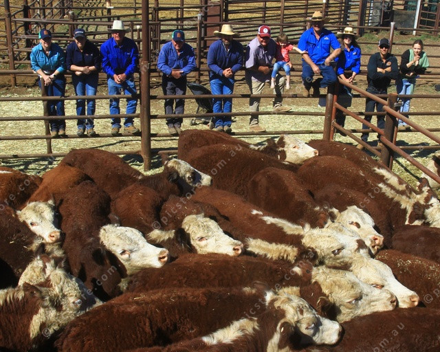 TOP DOLLAR: The Undoolya Station team with a pen of their prime Herefords that topped the market. (PIC: PHIL WILLIAMS 488363_06)