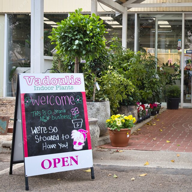 The sign outside marking the opening of Vadoulis Indoor Plants. (473098_25)