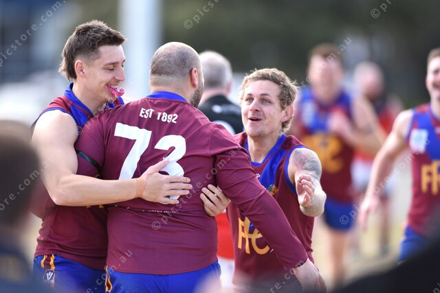 Matt Vaiano kicks goal 100. He will go on the kick the other goal 100. Teammates congratulate. 493634_04