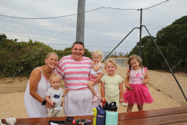 Enjoying all the volleyball fun were Alyshia Broadwood with Zavier Vogelsang, Haylee Vogelsang holding Mila Wilkinson, Hannah Vogelsang and Mahalia Wilkinson AKA Barbie.(Dee Elferink:527957_16)