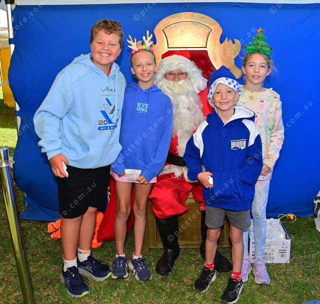 Saying hello to Santa are Nathan Foote, Eloise Stapledon, Hamish Foote, and Heidi Stapledon, of Victor Harbor. (Mark Liebich: 524622_11)