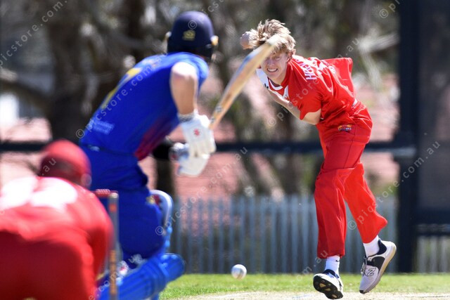 Harry Hoekstra ( Casey South Melbourne) bowls to Charlie Maxwell (Frankston). Maxwell is out on the bowl. 507560_10
