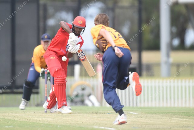 Ashley Chandrasinghe (Casey South Melbourne) faces a ball from Luke Stow (Kingston Hawthorn). 451355_12