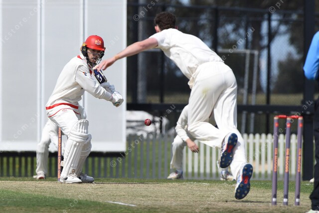 Tom Walker (Melbourne Uni) bowls to Finlay Gordon (Casey South Melbourne). 509515_05