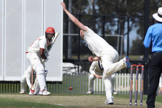 Tom Walker (Melbourne Uni) bowls to Ashley Chandrasinghe (Casey South Melbourne). 509515_06