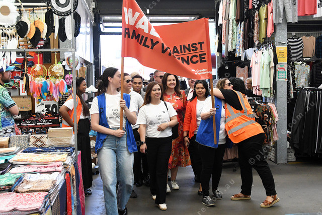 Emma from City of Greater Dandenong Youth and Family Services and Fran (victim survivor) lead the march through the Dandenong Market 519345_05