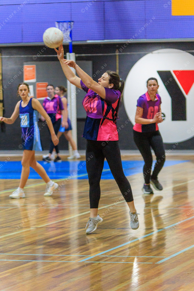 Strikers WD Ebony Freeman passes. (Blue) Sensations Mia Farrell, and (Purple) Strikers GD Rhianna Ross in background.