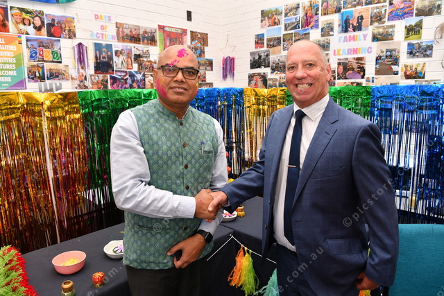 Wyndham Central College is throwing their Holi, the festival of colour. Pic of the Indian consular general Dr Shushil Kumar and acting principal Bryan Woolard. Photo by Damjan Janevski. 460725_02