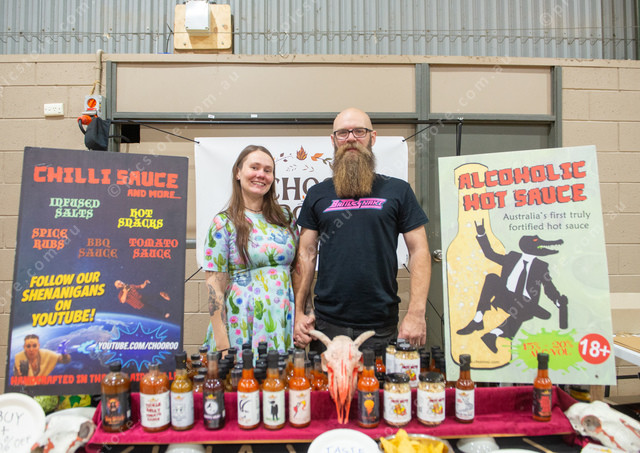 Quinn and Jakob Brunnbauer of Choo Roo with their hot sauce at the Willunga Chilli Festival. (Jack Church 536663_06)