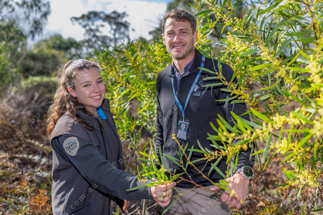 L-R Hannah Petrie (Parks Vic) and Stuart Boardman (Casey Council). Amongst some of the Wattle in the area.