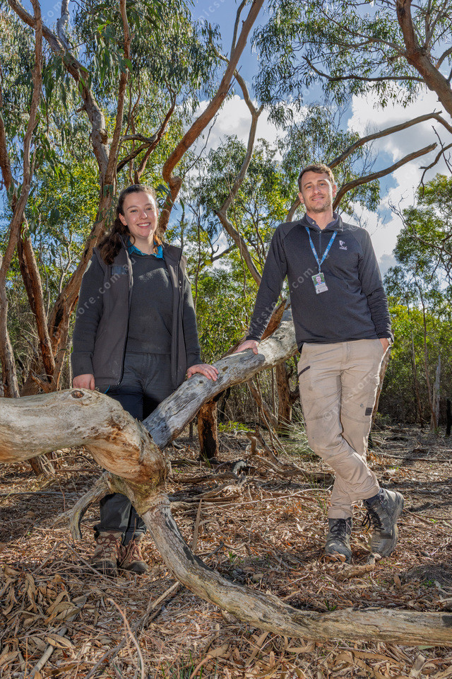 L-R Hannah Petrie (Parks Vic) and Stuart Boardman (Casey Council). Amongst an area that has been cleared.